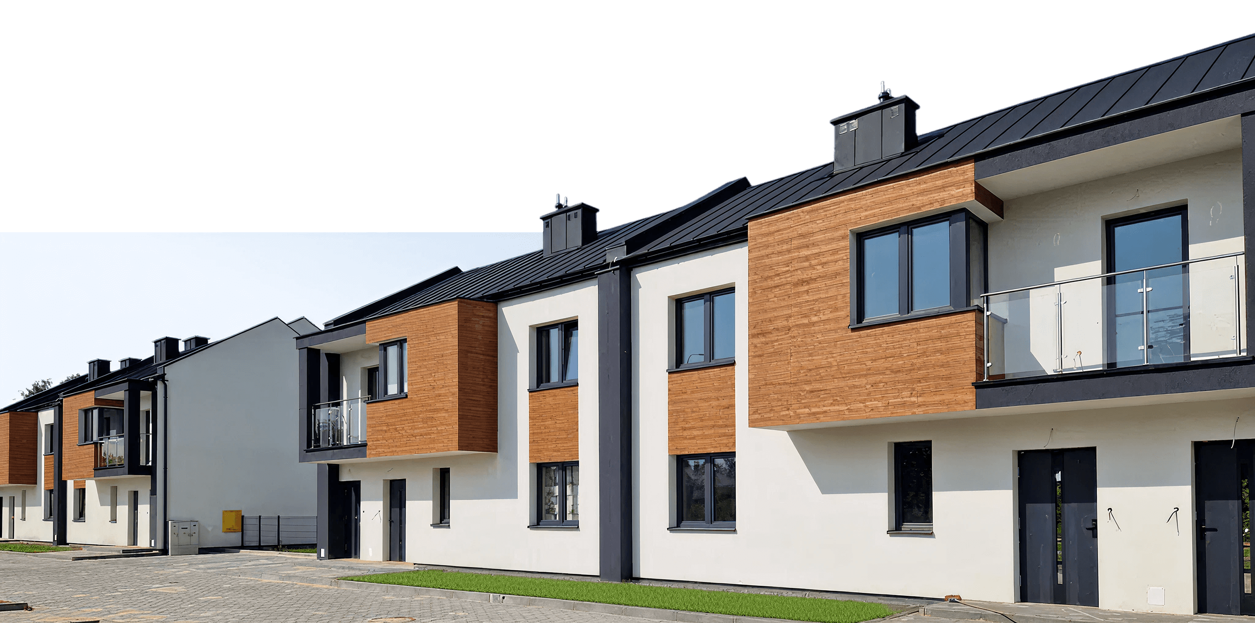 7 budynków w zabudowie bliźniaczej – nowoczesna architektura i spokojny charakter miejsca, idealne dla rodzin i osób ceniących prywatność.