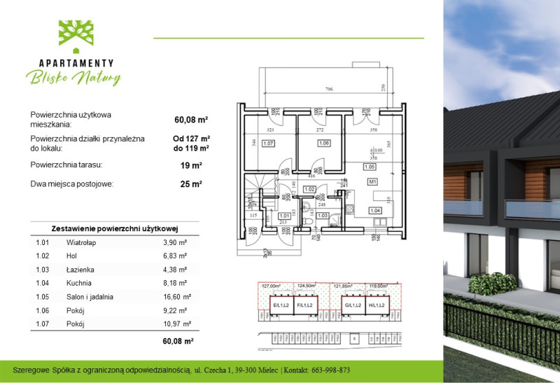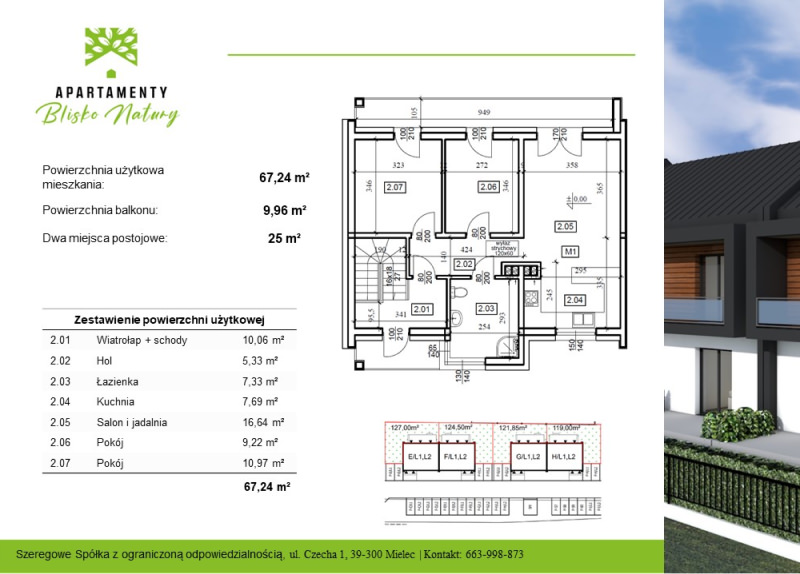 Funkcjonalne układy: parter z ogródkiem lub piętro z balkonami i strychem. Do każdego lokalu przewidziano dwa miejsca postojowe.